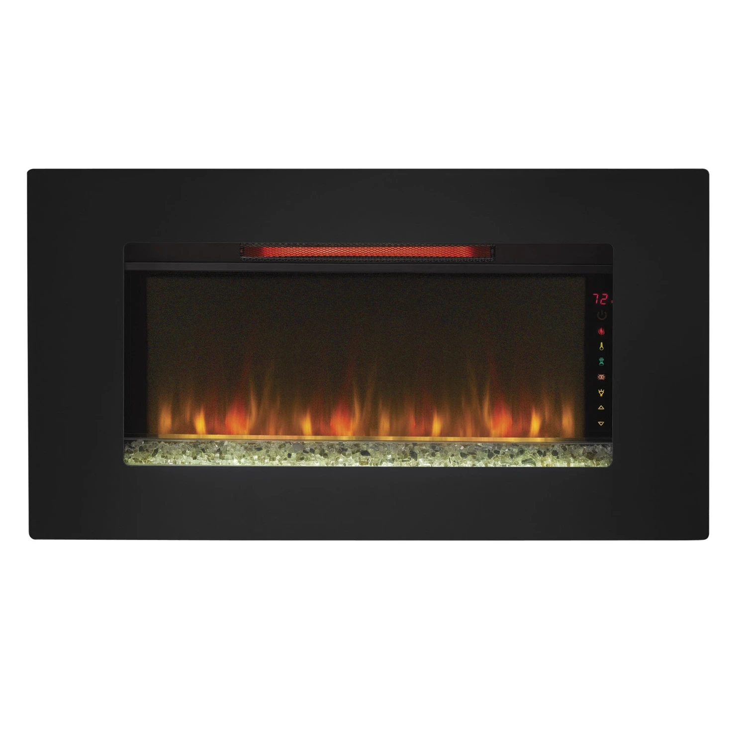 The Elysium 36″ wall mounted infrared quartz electric fireplace lets you maintain a safe, moist heat in your home without venting or gas lines. The Elysium can be hung as wall decor, mounted in a wall or can also stand independently using the included custom display stand providing the look of a roaring fire year round with or without heat. The heater provides supplemental zone heating for up to 1,000 square feet with 3 infrared quartz elements that are controlled by the adjustable thermostat. There are many ways to customize your fireplace with 3 media types included – translucent fire glass, ivory river rocks or rustic driftwood. Spectrafire™ offers 3 blue flame brightness settings and an additional setting with a traditional flame effect. Other features include a decorative LED sidelight that glows with five color options: Amber, Blue, Amber & Blue, Color Cycling and Off. Slim line remote control, custom stand and wall mounting hardware included.