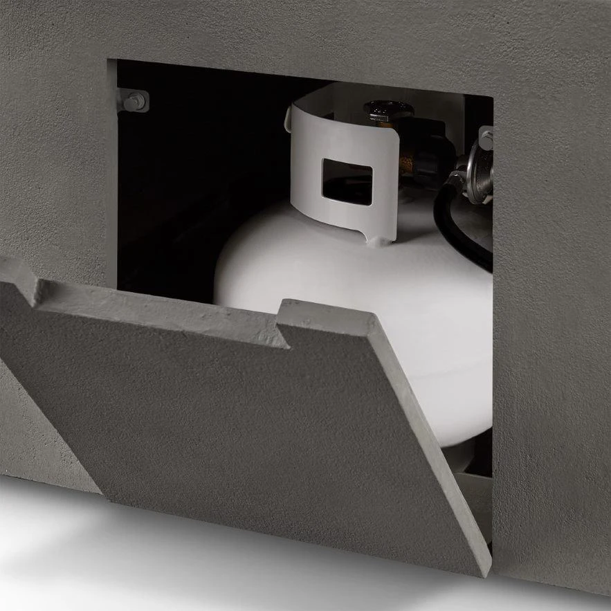 | Create your ideal outdoor gathering space with the stylish and versatile design of this casual, square fire table. Made in the USA with glass fiber reinforced concrete (GFRC), the Eureka Casual Square Fire Table has a simplified silhouette and a rustic finish, with a brass burner system that produces rich and inviting flames. This table features room within the base to conceal the required 11 lb propane tank and has a convenient access door. Available in either natural gas or propane in a flint or carbon finish. Includes fire table with brass burner, black lava rock fille, valve key, polyester storage cover and 8′ NG hose with quick connect socket. Once purchased, unit cannot be converted to a different type of gas.