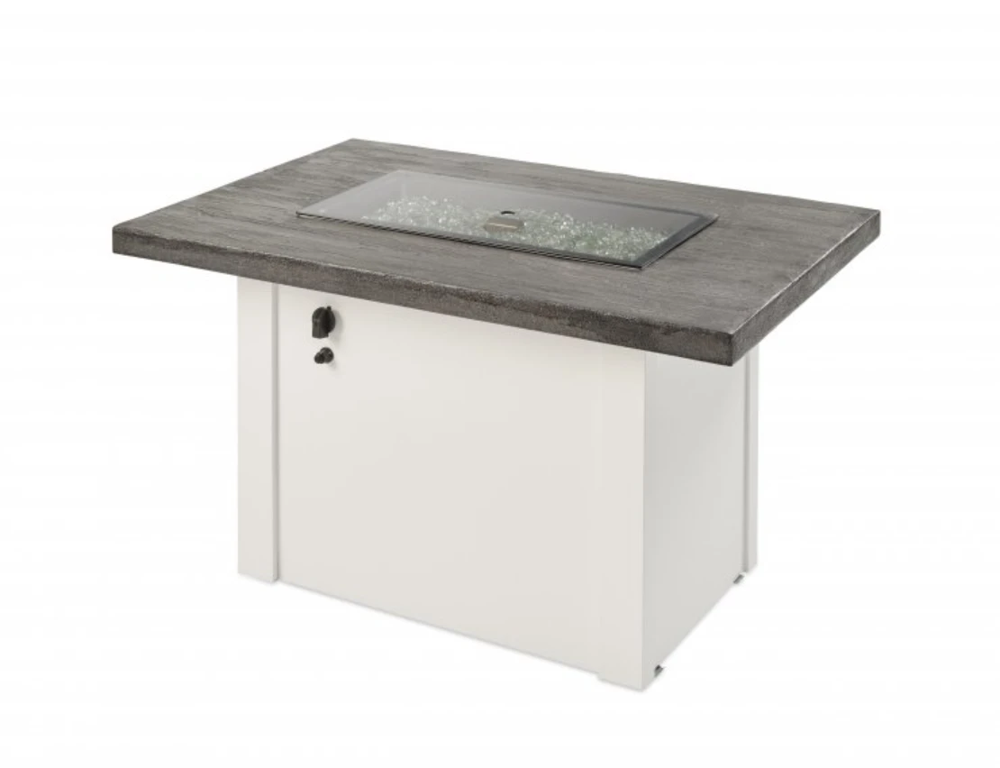 | The Stone Grey Havenwood Gas Fire Pit Table offers a contemporary style that’s perfect for entertaining. The unique Stone Grey Everblend textured top pairs with a White powder-coated metal base. The 12″ x 24″ Crystal Fire® Plus burner offers a warm, inviting glow. Every handcrafted Everblend top is one-of-a-kind – variations in color, texture, and pattern will occur.
