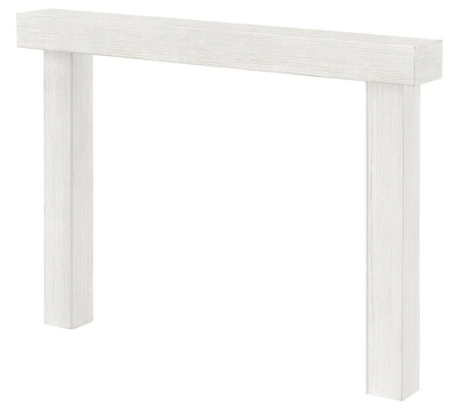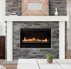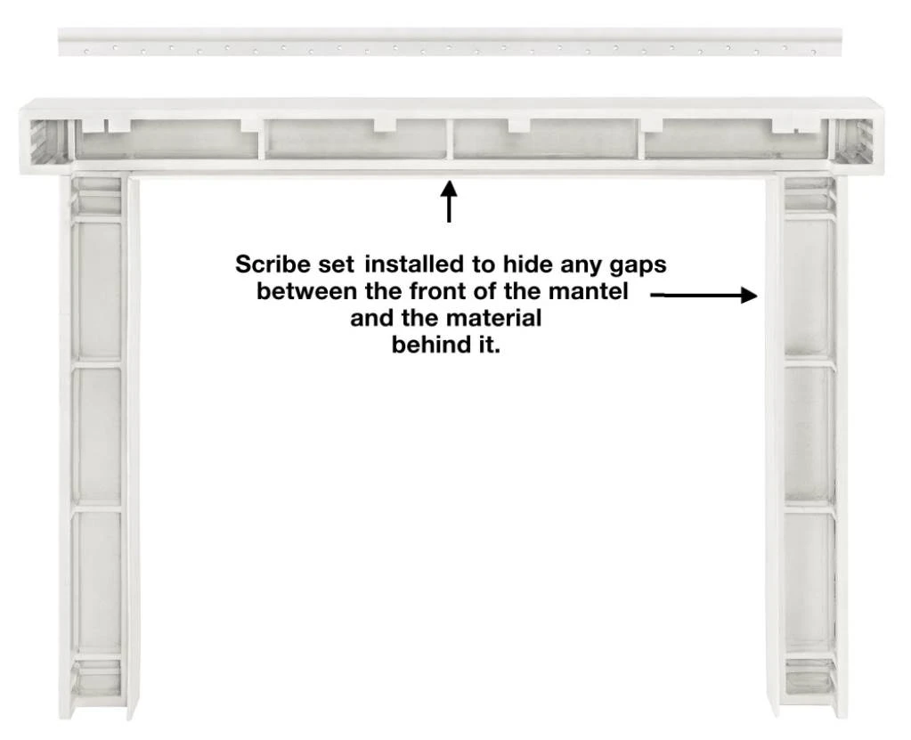 | This mantel can take the heat! Patent pending on this all new non-combustible mantel surround for use indoors or out. Light-weight, strong, weather-resistant and easy to hang. The Zachary has a soft white, lightly textured, hand applied paint finish making each surround unique in character and its own individual masterpiece. Transitional design that fits comfortably into a contemporary or traditional setting makes this piece the perfect addition to your indoor or out-door room. The ample 8 inch shelf depth allows plenty of display room. Pre-drilled metal hanger board, exclusive to this piece, allows for ease of hanging. Mantel in 3 pieces; 2 legs and 1 header. The legs attach easily to the header with nuts and bolts. 3 piece mitered scribe molding set also included to hide any gaps after installation. This mantel has a 1 1/2″ projection off of the wall leaving a nice pocket behind the mantel to accommodate your tile, stone, marble etc.