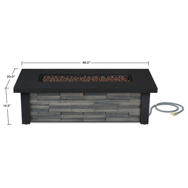 | The Berthoud fire table is the perfect addition to any patio. With it’s powder-coated steel frame and faux stacked stone sides, the Berthoud adds warmth and a contemporary style to any outdoor space. This fire table includes a propane tank seat, red lava rock, a metal lid and PVC cover to protect the unit when it is not in use. The Berthoud can be converted to natural gas with the conversion kit, included with the table.