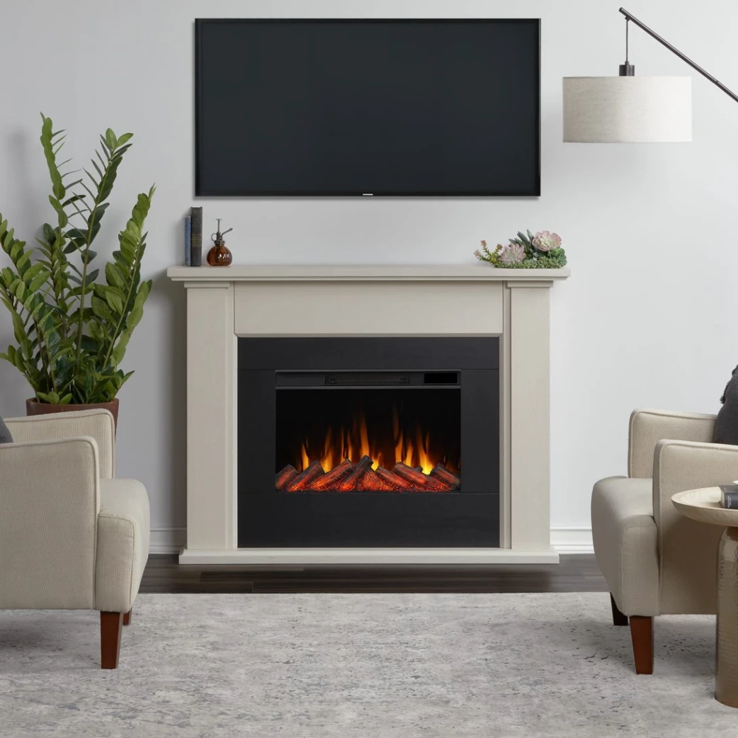 | With a mantel depth of less than 10″ the Tejon Electric Fireplace is ideal for smaller rooms, apartments or offices. This fireplace has a minimal, classic design and features dynamic glowing embers that create a relaxing, welcoming ambiance. The Vivid Flame Electric Firebox mimics the look of a real fire, but does not require a chimney or vents and plugs into a standard outlet for convenient set up. Features include multiple flame colors, five brightness settings and remote control.