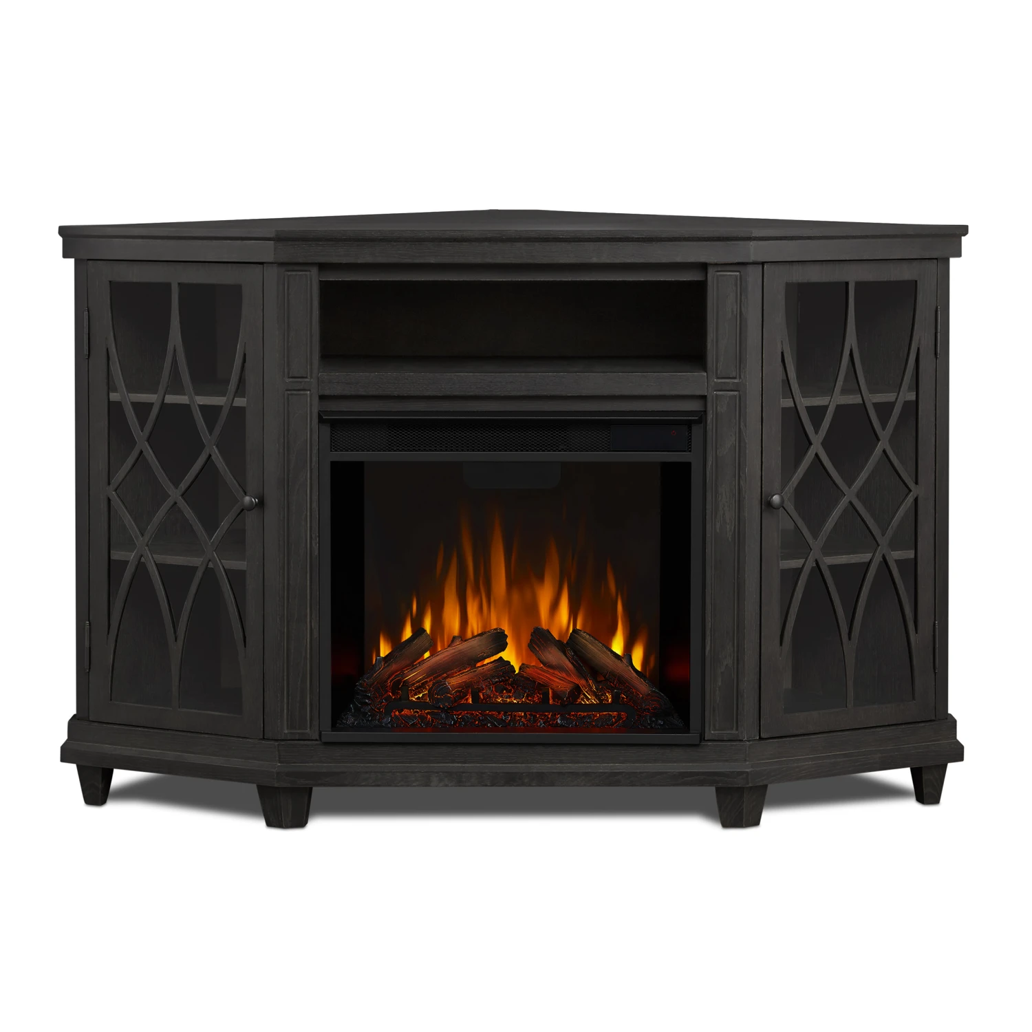 | The Lynette Media Cabinet has a fresh, contemporary corner design and functional, adjustable storage shelves behind elegant glass and mullion doors. The VividFlame Electric Firebox mimics the look of a real fire, but does not require a chimney or vents and plugs into a standard outlet for convenient set up. Features include infrared LED technology, sleek touch controls, and dynamic glowing embers.