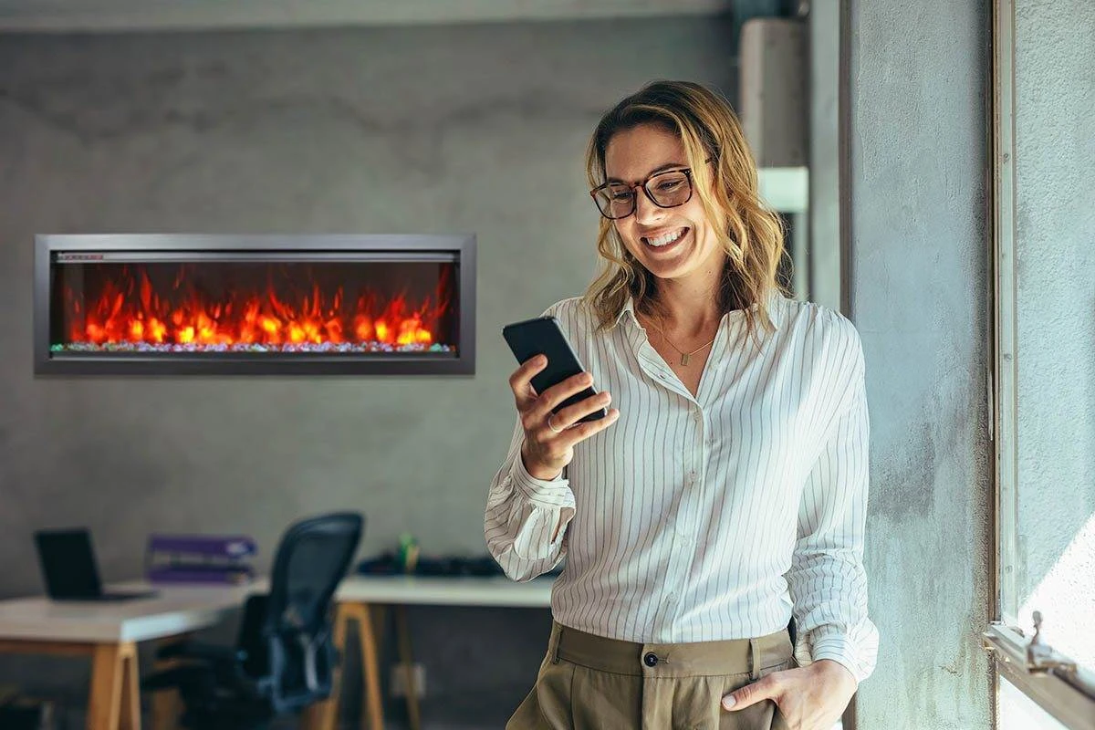 The WiFi app allows for control of fireplace functions including sound, programmable timers, and control of the flame height and speed. SYM-BESPOKE fireplaces are rated for Indoor or Outdoor use. Features: