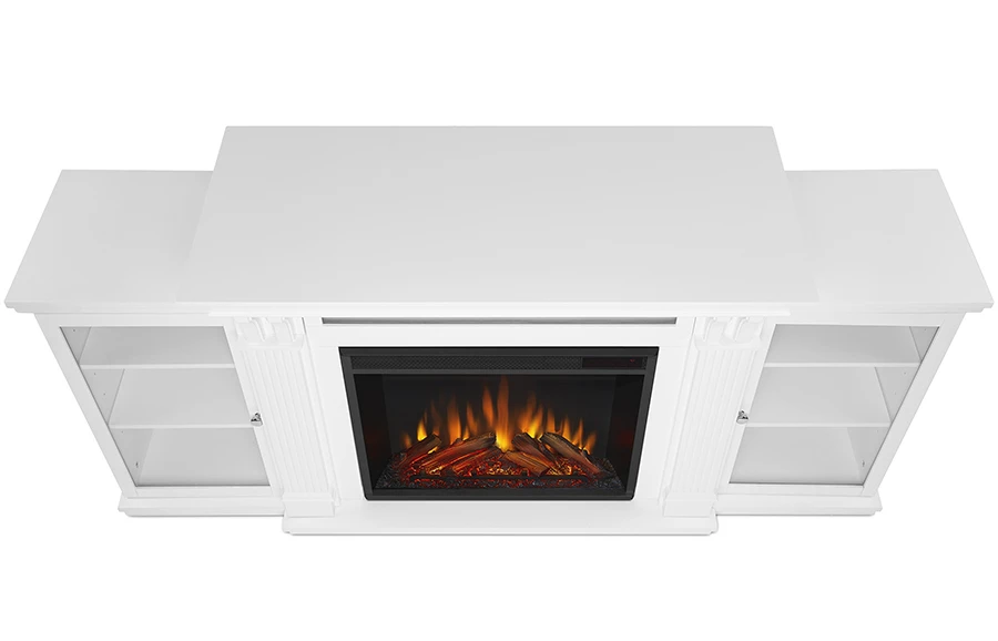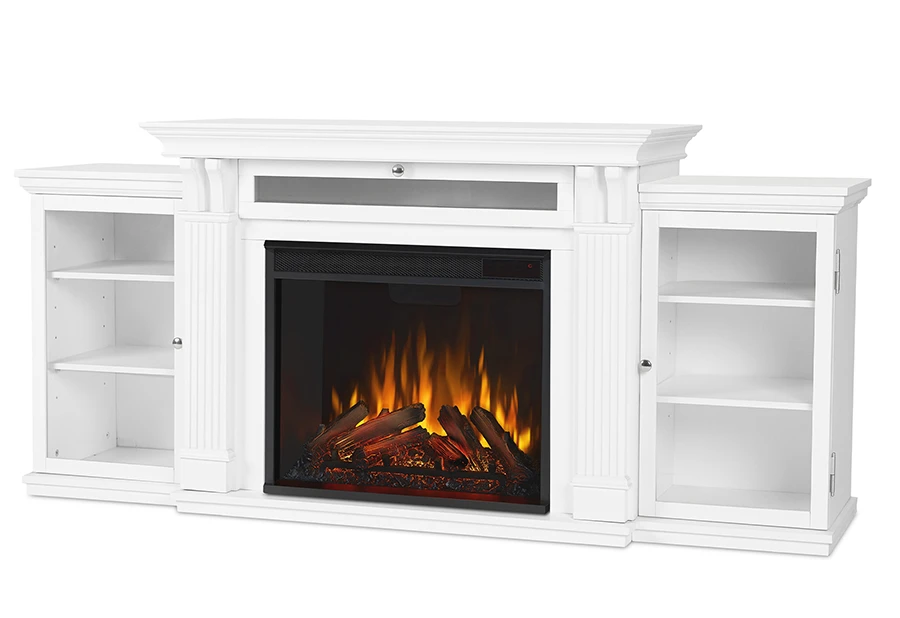 | The Calie Media Cabinet has a center shelf with a drop down glass door and dual side cabinets with glass doors and adjustable shelves. Carved columns, curved supportive corbels and crown molding come together to create this elegant, classic piece. The VividFlame Electric Firebox mimics the look of a real fire, but does not require a chimney or vents and plugs into a standard outlet for convenient set up. Features include infrared LED technology, sleek touch controls, and dynamic glowing embers.