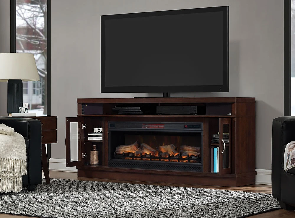 The Deerfield TV stand for TVs up to 80″ and up to 155 lbs. is an attractive piece for any home. The Antique Brown Cherry finish is accented by the Brushed Nickel hardware. The partitioned media shelf and two glass-front side cabinets perfectly store AV components and entertainment accessories. Experience high quality sound from the integrated sound system with (2) 4” main speakers, (2) 1” tweeters and forward facing passive bass ports. Wirelessly stream audio from any Bluetooth® enabled device anywhere in the room. Complete your TV stand with a 42″ ClassicFlame® electric fireplace. 42II042FGT Infrared Fireplace Insert Product Description (included with purchase): To add warmth and inviting ambiance to your home, add this 42” infrared quartz electric fireplace insert to your mantel or TV stand. The infrared quartz heat helps to maintain the natural humidity in the air, resulting in moist, comfortable heat without drying out the room’s air. Providing supplemental zone heating for up to 1,000 square feet and showcasing stunning flame effects, this electric fireplace is sure to create a welcoming environment. Patent pending 3D flame effect technology offers a layered flame effect to create a truly realistic fire experience. The customizable 3D flame effect technology offers 125 selectable effect options to create your ideal fire, displayed on a realistic log set and ember bed or contemporary tray with large glass rocks (both options included). Five flame speed settings allow you to adjust from a fast roaring fire down to a gentle flickering flame, while five adjustable brightness settings allow you to select the perfect fire display for any occasion. Flame effect colors include Spectrafire, Sapphire, Amethyst, Campfire, Midnight Fire and auto cycle. The flame effects can be used with or without heat for year-round enjoyment. Change the settings easily using the control panel on the unit or with the included remote control. Use this fireplace worry-free as it is equipped with Safer Plug™ and Safer Sensor™ fire prevention technology. Safer Plug™ continuously monitors the temperature of the plug, and will turn off automatically if overheating occurs. Safer Sensor™ fire prevention technology alerts you when the heater is obstructed and will automatically shut off to prevent damage. This insert powers the LED lights on compatible TV stands and mantels.