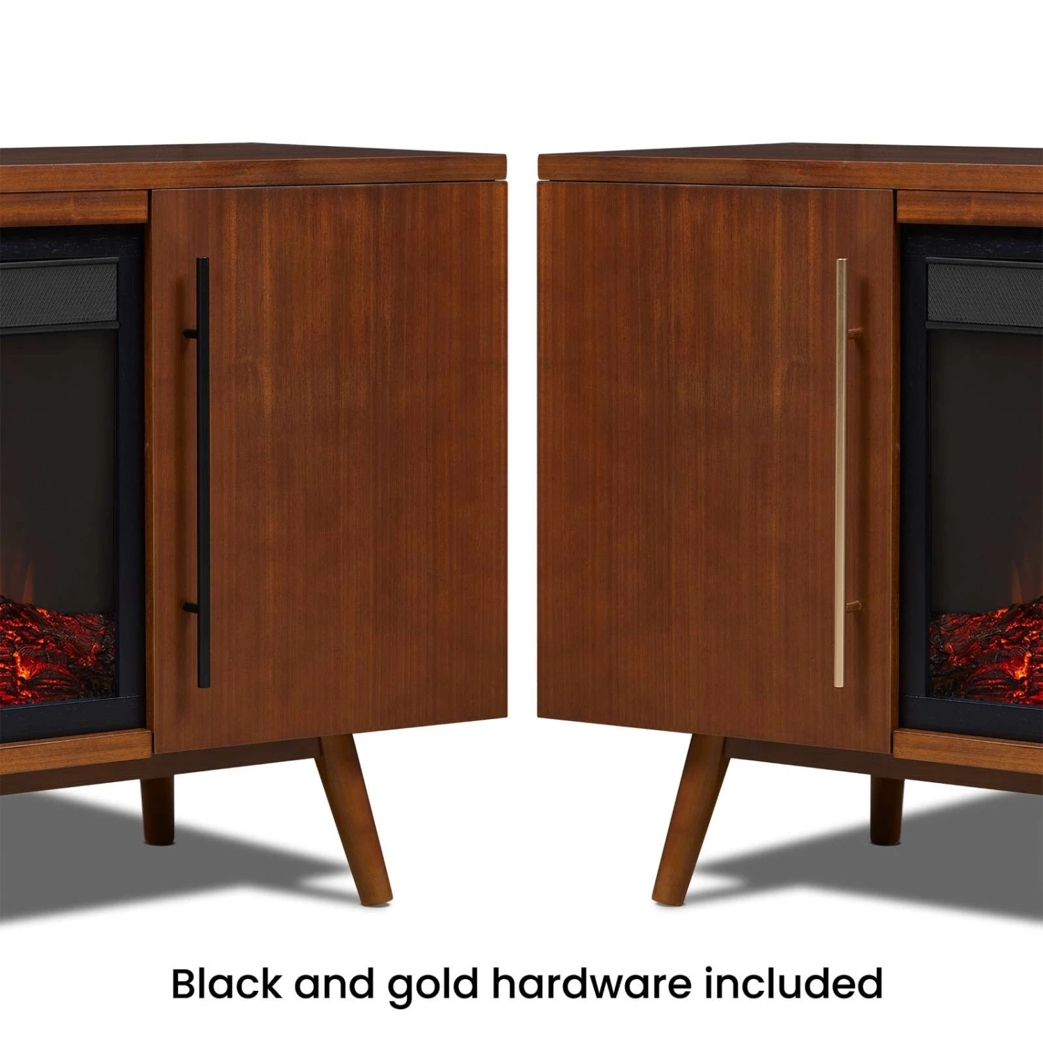 | With clean lines, tapered legs and minimalist hardware, the Morris electric fireplace embodies the iconic mid-century aesthetic. Enjoy the modern functions of this fireplace and practical storage possibilities while staying true to your style. Part of the Real Flame® VividFlame Landscape Series, the widescreen electric firebox mimics the look of a real, flickering fire, but does not require a chimney or vents and conveniently plugs into a standard outlet. This free-standing, extra-long fireplace entertainment center can accommodate TVs up to 70″. Features a mantel with a real wood finish, six flame colors, five flame brightness levels, adjustable thermostat, timer function and automatic safety shut-off. The electric fireplace insert provides supplemental heat for rooms up to 1,000 sq ft or the heater can be turned off so you can enjoy the comforting ambiance of a glowing fireplace year-round. Mantel, firebox with log set, hardware and remote control are included.