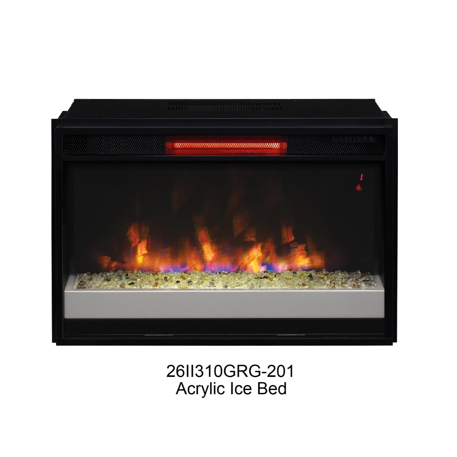 This contemporary media mantel has four speakers that provides amazing sound, alongside with its integrated sound bar, it will turn any room into a media hub for the entire house. It also features two tweeters, rear facing passive bass port, and powered subwoofer. Smoked tempered glass doors, solid black finish, and stainless steel legs. Classic Flame Electric Fireplace Insert can be used with or without heat for year round usage. This TV stand for TVs up to 80″ and up to 155 lbs. is the perfect modern piece with its sleek and clean design. Smoked glass and Silver powder coated metal legs further enhance the design of this svelte unit. The two side storage cabinets with smoked glass doors and adjustable shelves organize accessories and AV components. The pass through holes hide and manage unsightly wires and cables. Experience rich sound from the integrated 2.1 sound system featuring (2) 3″ main speakers, (2) 3″ built-in subwoofers and rear facing passive bass ports. 26II042FGL Infrared Fireplace Insert Product Description (included with purchase): To add warmth and inviting ambiance to your home, add this 26″ infrared quartz electric fireplace insert to your mantel or TV stand. The infrared quartz heat helps to maintain the natural humidity in the air, resulting in moist, comfortable heat without drying out the room’s air. Providing supplemental zone heating for up to 1,000 square feet and showcasing stunning flame effects, this electric fireplace is sure to create a welcoming environment. Patent pending 3D flame effect technology offers a layered flame effect to create a truly realistic fire experience. The customizable 3D flame effect technology offers 125 selectable effect options to create your ideal fire, displayed on a realistic log set and ember bed. Five flame speed settings allow you to adjust from a fast roaring fire down to a gentle flickering flame, while five adjustable brightness settings allow you to select the perfect fire display for any occasion. Flame effect colors include Spectrafire, Sapphire, Amethyst, Campfire, Midnight Fire and auto cycle. The flame effects can be used with or without heat for year-round enjoyment. Change the settings easily using the control panel on the unit or with the included remote control. Use this fireplace worry-free as it is equipped with patent pending Safer Plug™ and Safer Sensor™ fire prevention technology. Safer Plug™ continuously monitors the temperature of the plug, and will turn off automatically if overheating occurs. Safer Sensor™ fire prevention technology alerts you when the heater is obstructed and will automatically shut off to prevent damage. This insert powers the LED lights on compatible TV stands and mantels. 26II310GRG-201 Infrared Fireplace + Contemporary Insert Product Description: To add warmth and inviting ambiance to your home, add this 26″ infrared quartz electric fireplace insert to your mantel or TV stand. The infrared heat helps to maintain the natural humidity within the air, resulting in moist, comfortable heat without drying out the room’s air. Providing supplemental zone heating for up to 1,000 square feet and showcasing stunning flame effects, this electric fireplace is sure to create a welcoming environment. Spectrafire® Plus customizable flame effect technology offers 125 selectable effect options to create your ideal fire, displayed on a contemporary, silver tray with clear crystal rocks. Five flame speed settings allow you to adjust from a fast roaring fire down to a gentle flickering flame, while five adjustable brightness settings allow you to select the perfect fire display for any occasion. Flame effect colors include Spectrafire, Sapphire, Amethyst, Campfire, Midnight Fire and auto cycle. The flame effects can be used with or without heat for year round enjoyment. Change the settings easily using the control panel on the unit or with the included remote control. The on-screen function indicator displays thermostat settings and icons to show the current status of insert functions. Use this fireplace worry free as it is equipped with Safer Plug fire prevention technology. Safer Plug continuously monitors the temperature of the plug, and will turn off automatically if overheating occurs to prevent electrical fire, circuit or product damage.