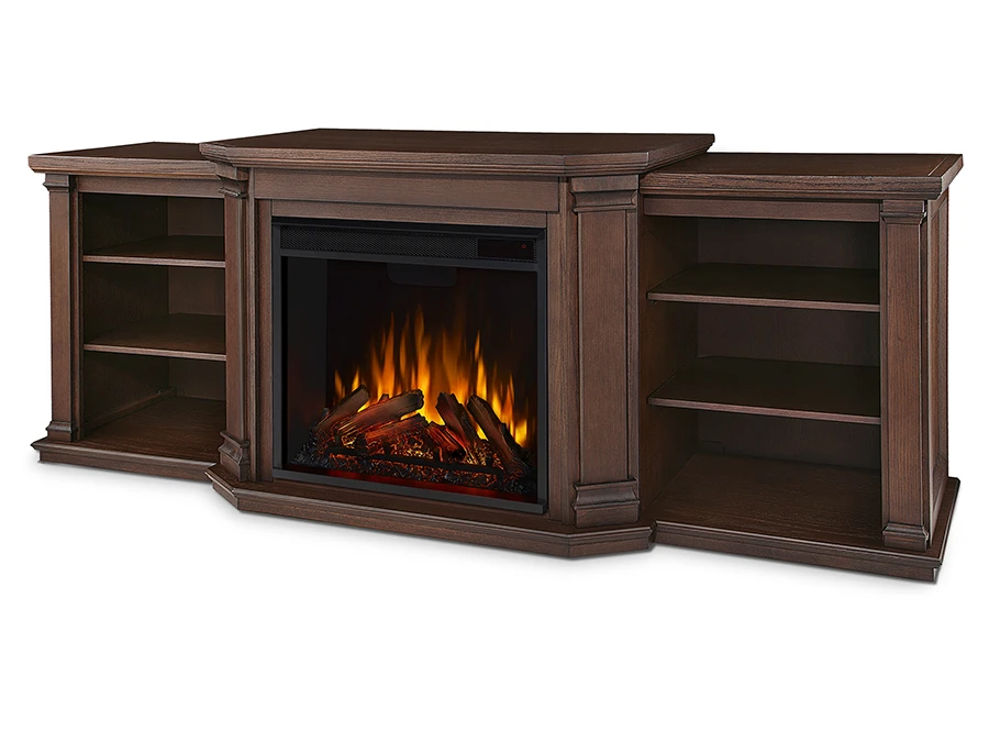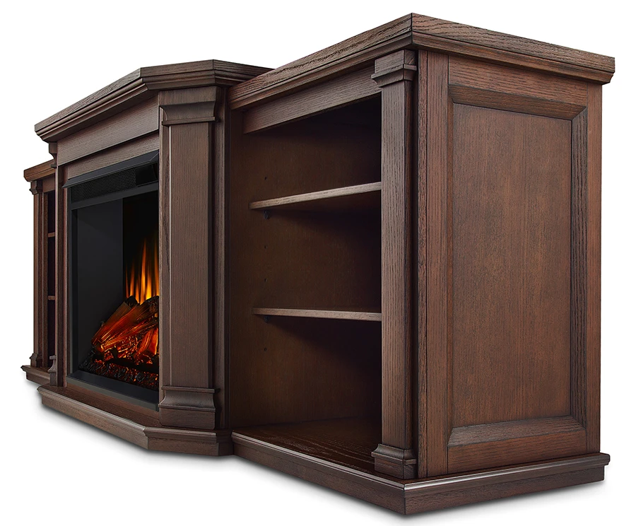 | Handsome, angled columns are topped with flared corbels and flanked with recessed shelving to give The Valmont Media Console a sculpted and elegant profile. The VividFlame Electric Firebox mimics the look of a real fire, but does not require a chimney or vents and plugs into a standard outlet for convenient set up. Features include infrared LED technology, sleek touch controls, and dynamic glowing embers.