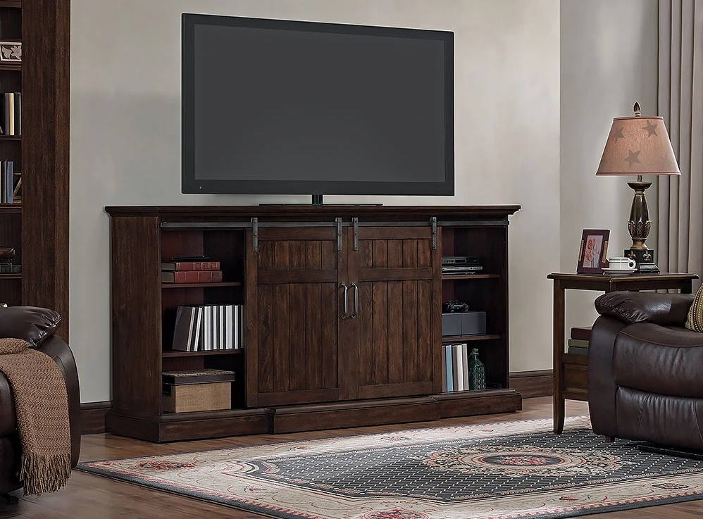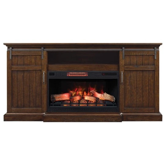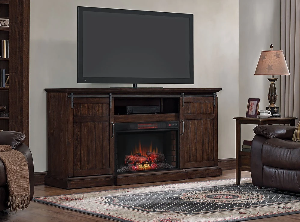Get the trendy barn door look without undergoing major construction by adding the Cabaret TV stand with an infrared quartz electric fireplace to any room in the home. The barn doors slide to cover the 32″ fireplace when it’s powered off. This TV stand holds most flat screen TVs up to 80″ and 155 lbs. An open media shelf and side cabinets with storage offer customizable storage for media equipment and accessories. The Pewter hardware complements the Distressed Oak finish, constructed of real wood veneer and solids. Providing supplemental zone heating for up to 1,000 square feet and showcasing realistic flame effects, this electric fireplace is sure to create a welcoming environment. The infrared quartz heat helps to maintain the natural humidity within the air. Patent pending 3D flame effect technology offers a layered flame effect to create a truly realistic fire experience. The customizable 3D flame effect technology offers 125 selectable effect options to create your ideal fire, displayed on a realistic log set and ember bed. The flame effects can be used with or without heat for year-round enjoyment. Use this fireplace worry-free as it is equipped with patent pending Safer Plug™ and Safer Sensor™ fire prevention technology. Safer Plug™ continuously monitors the temperature of the plug, and will turn off automatically if overheating occurs. Safer Sensor™ fire prevention technology alerts you when the heater is obstructed and will automatically shut off to prevent damage. 32II042FGL Infrared Fireplace Insert Product Description (included with purchase): To add warmth and inviting ambiance to your home, add this 32″ infrared quartz electric fireplace insert to your mantel or TV stand. The infrared quartz heat helps to maintain the natural humidity in the air, resulting in moist, comfortable heat without drying out the room’s air. Providing supplemental zone heating for up to 1,000 square feet and showcasing stunning flame effects, this electric fireplace is sure to create a welcoming environment. Patent pending 3D flame effect technology offers a layered flame effect to create a truly realistic fire experience. The customizable 3D flame effect technology offers 125 selectable effect options to create your ideal fire, displayed on a realistic log set and ember bed. Five flame speed settings allow you to adjust from a fast roaring fire down to a gentle flickering flame, while five adjustable brightness settings allow you to select the perfect fire display for any occasion. Flame effect colors include Spectrafire, Sapphire, Amethyst, Campfire, Midnight Fire and auto cycle. The flame effects can be used with or without heat for year-round enjoyment. Change the settings easily using the control panel on the unit or with the included remote control. Use this fireplace worry-free as it is equipped with patent pending Safer Plug™ and Safer Sensor™ fire prevention technology. Safer Plug™ continuously monitors the temperature of the plug, and will turn off automatically if overheating occurs. Safer Sensor™ fire prevention technology alerts you when the heater is obstructed and will automatically shut off to prevent damage. This insert powers the LED lights on compatible TV stands and mantels.