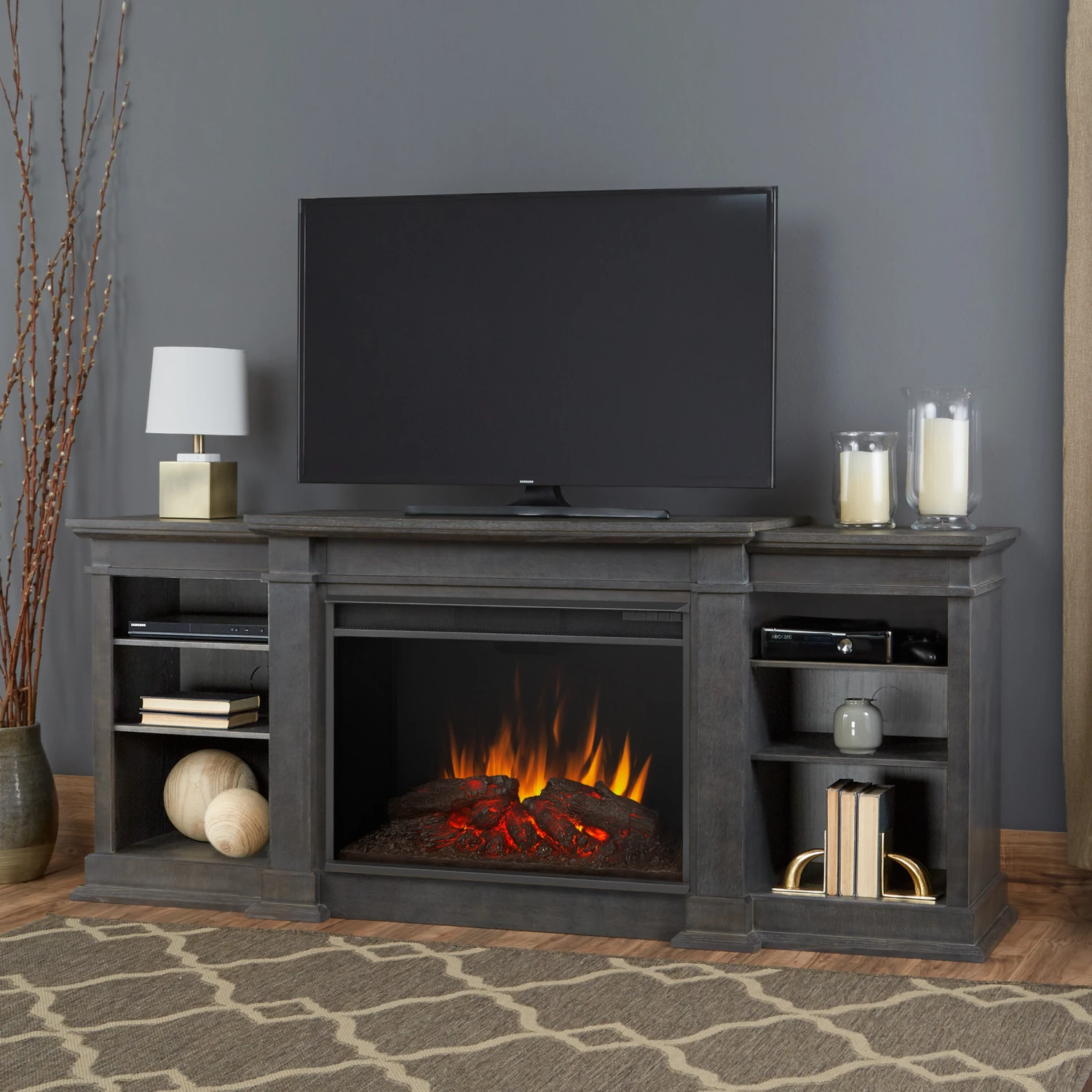 | The Eliot Grand Media Console has a classic design that blends well with many interiors to provide a warm, charming centerpiece for your home. Exclusively designed, the Vivid Flame Grand Electric Firebox is 30% larger than our standard firebox and mimics the look of a real fire, but does not require a chimney or vents. Features include infrared LED technology, six thermostat settings and dynamic glowing embers.